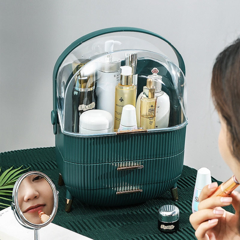 This stylish dust-proof cosmetic organizer can be used on your vanity counter, bedside table, closet, or bathroom vanity. It will fit very well with the design of any room. The cosmetic storage container with a handle is convenient to carry whether traveling or on the go. Modern and simple, elegant and practical.